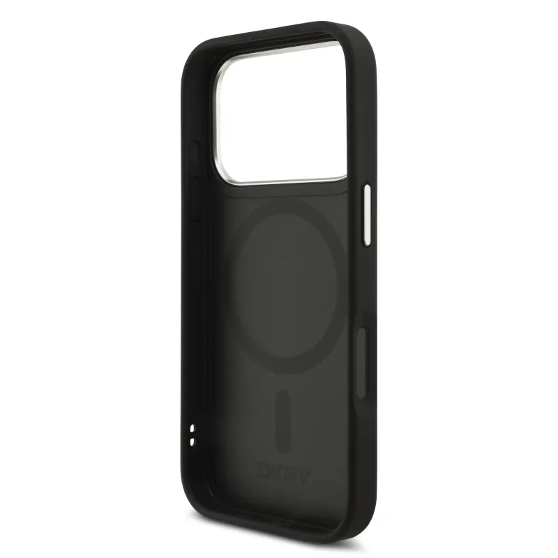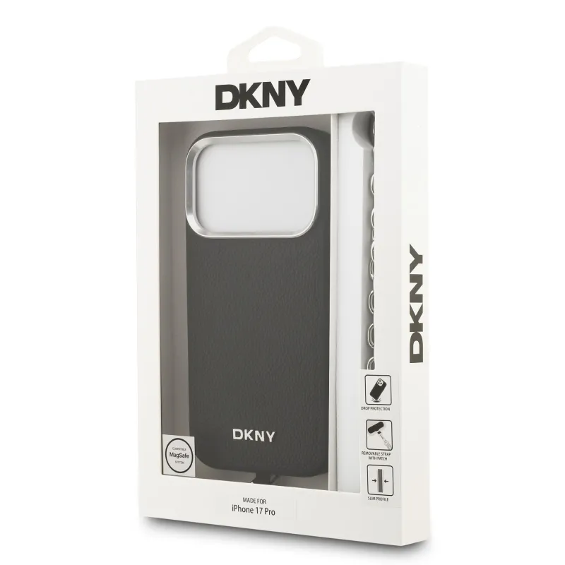 DKNY PU bőr fém logós csuklólánc MagSafe hátlap iPhone 17 Pro fekete színűre