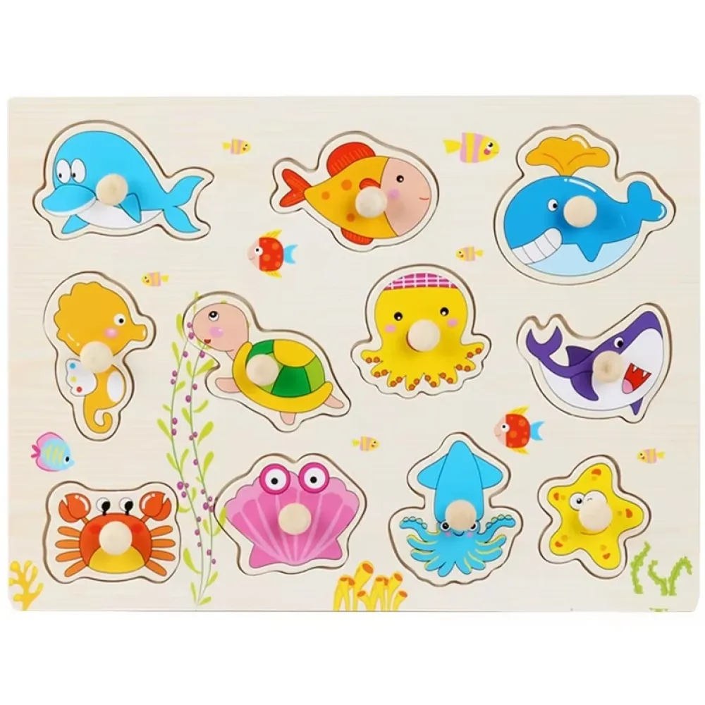 Fából készült gyermek puzzle fogantyúval - víz alatti élet