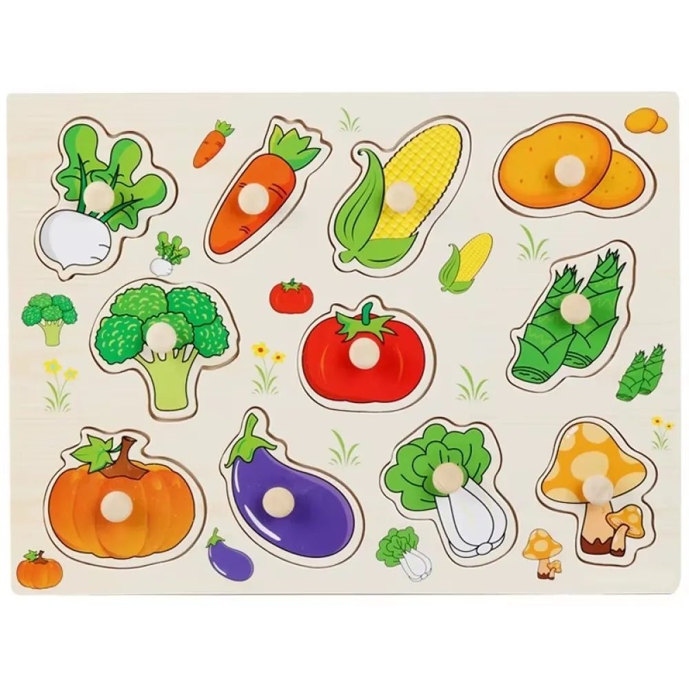 Fából készült gyermek puzzle fogantyúval - zöldségek