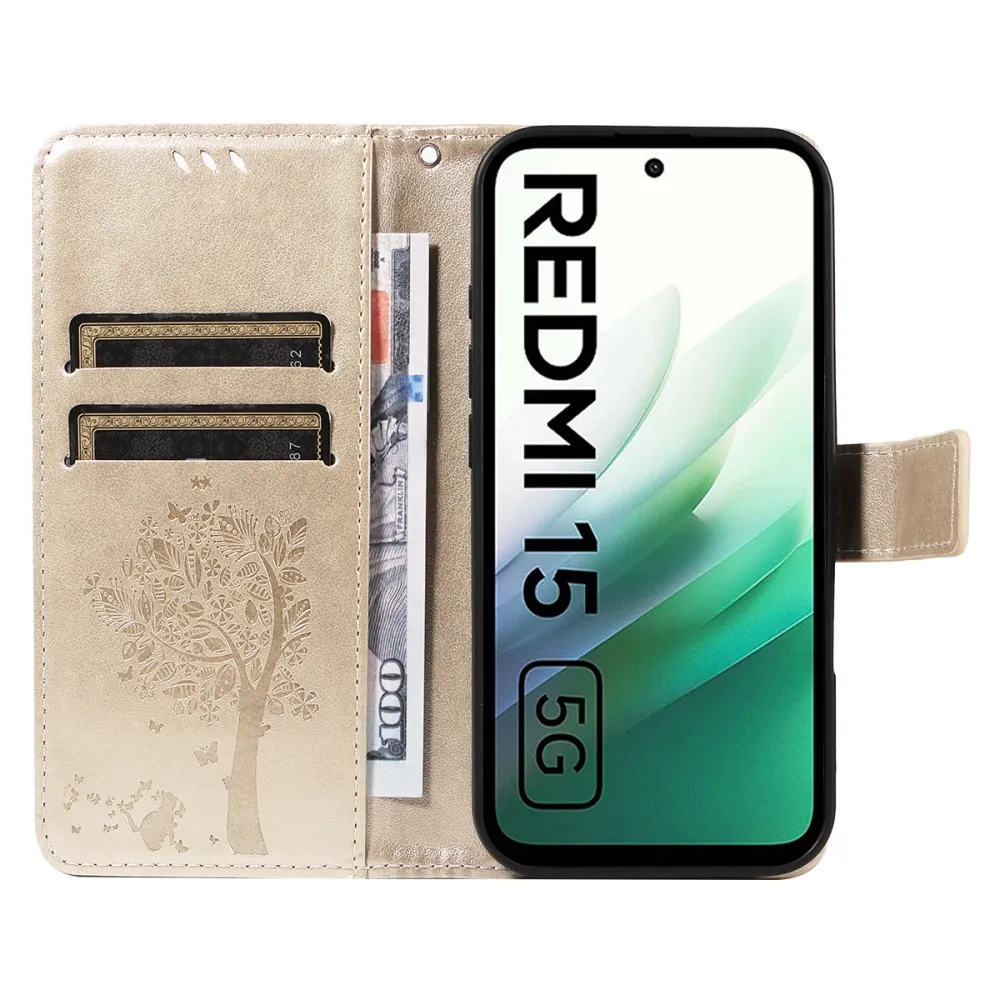 Arany pénztárca tok fák a Xiaomi Redmi 15 4G (171mm) számára