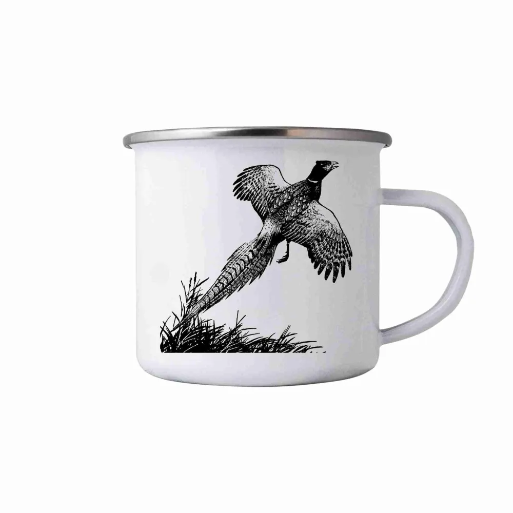 A bögrén egy repülő fácán látható, abban a pillanatban, amikor felszáll a fű közül a szabad ég felé. A finom vonalvezetés természetes hatást kelt, kiemeli a szárnyak formáját és a mozdulat eleganciáját. Az egész motívum élettel teli, felidézi a természet nyugalmát és megszólít mindenkit, aki szereti az erdőt, az állatokat és a hagyományos vadászati hangulatot.
