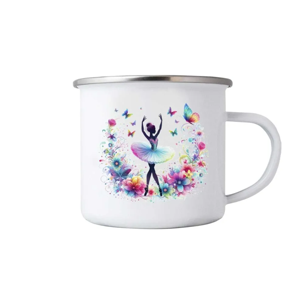 A színes virágokkal és pillangókkal körülvett balerina sziluettje varázslatos hangulatot ad ennek a bádog bögrének. A motívum légies és játékos, ezért tökéletes választás mindenkinek, aki szereti a táncot, a fantáziát és a finom, mesés illusztrációkat.
