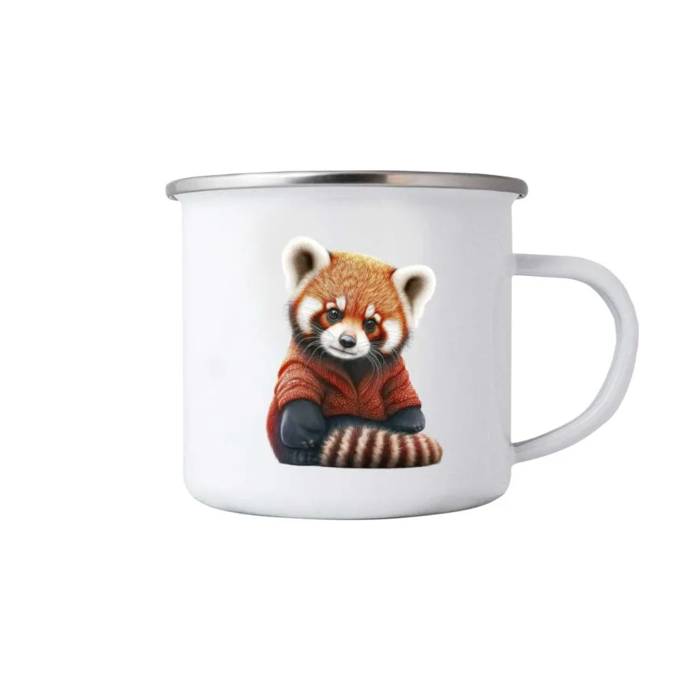A kis vörös panda puha kötött pulóverben jelenik meg a bögrén ami játékos és szerethető motívumot teremt. A színes bundarészletek a jellegzetes csíkos farok és a finoman kidolgozott pulóver együtt barátságos és vidám összhatást adnak a dizájnnak.