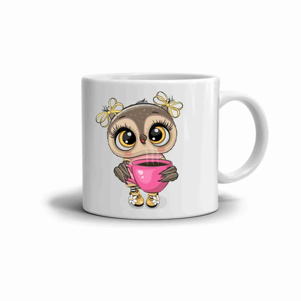 A bögre motívuma játékos és barátságos hangulatot áraszt. Az aranyos bagoly hatalmas szemekkel egy rózsaszín bögrét tart a kezében, benne forró itallal, ami a nyugalom és a reggeli kényelem érzetét kelti. A sárga masnik és az apró részletek vidám, optimista hangulatot adnak a mintának, amely feldobja a napot.