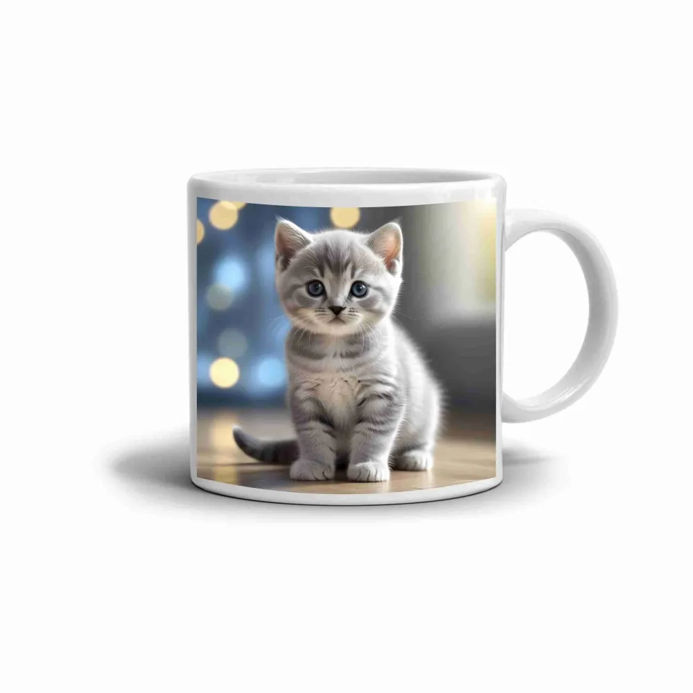 A bögre motívuma egy aranyos szürke kiscicát ábrázol, amely ártatlanul figyeli a körülötte lévő világot. A háttérben lágy fény teremt meleg és otthonos hangulatot, amelytől az egész kép gyengéd és megnyugtató hatású.