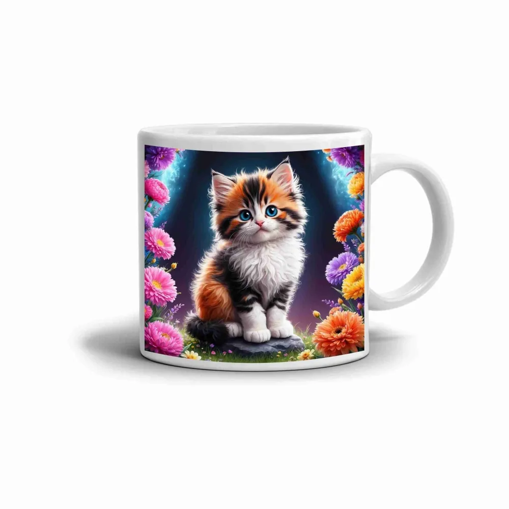 A bögrén egy aranyos cirmos macska látható, aki virágok között ül és kíváncsian néz körbe. A szőrzet finom részletei és a pasztell színek játékos és barátságos hangulatot teremtenek. A motívum pozitív energiát és bájt sugároz, amely minden reggeli pillanatot vidámabbá tesz.