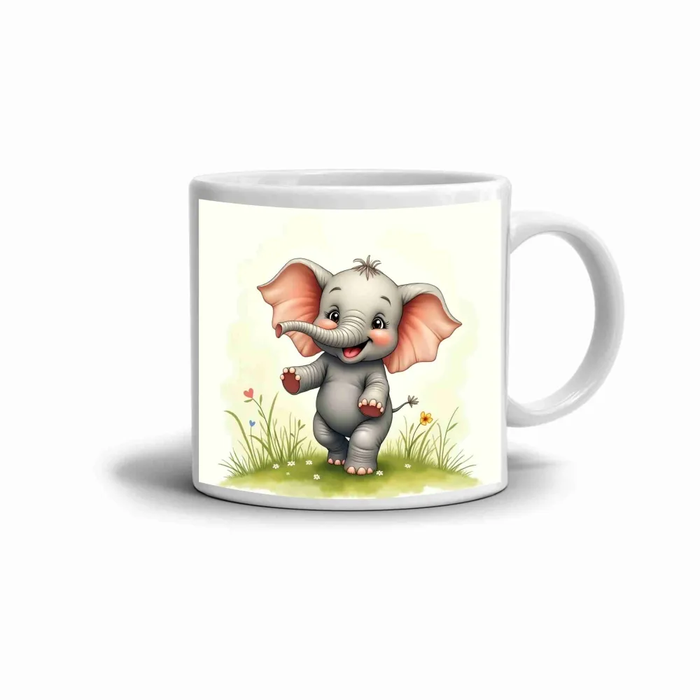 A bögre motívuma egy aranyos, rózsaszín fülű kis elefántot ábrázol, aki vidáman és barátságosan mosolyog. Játékos testtartása és kedves arckifejezése örömöt és derűt sugároz. A fű és a virágok színes részletei gyengédséget és gyermeki ártatlanságot kölcsönöznek a mintának, amely minden napot felvidít.