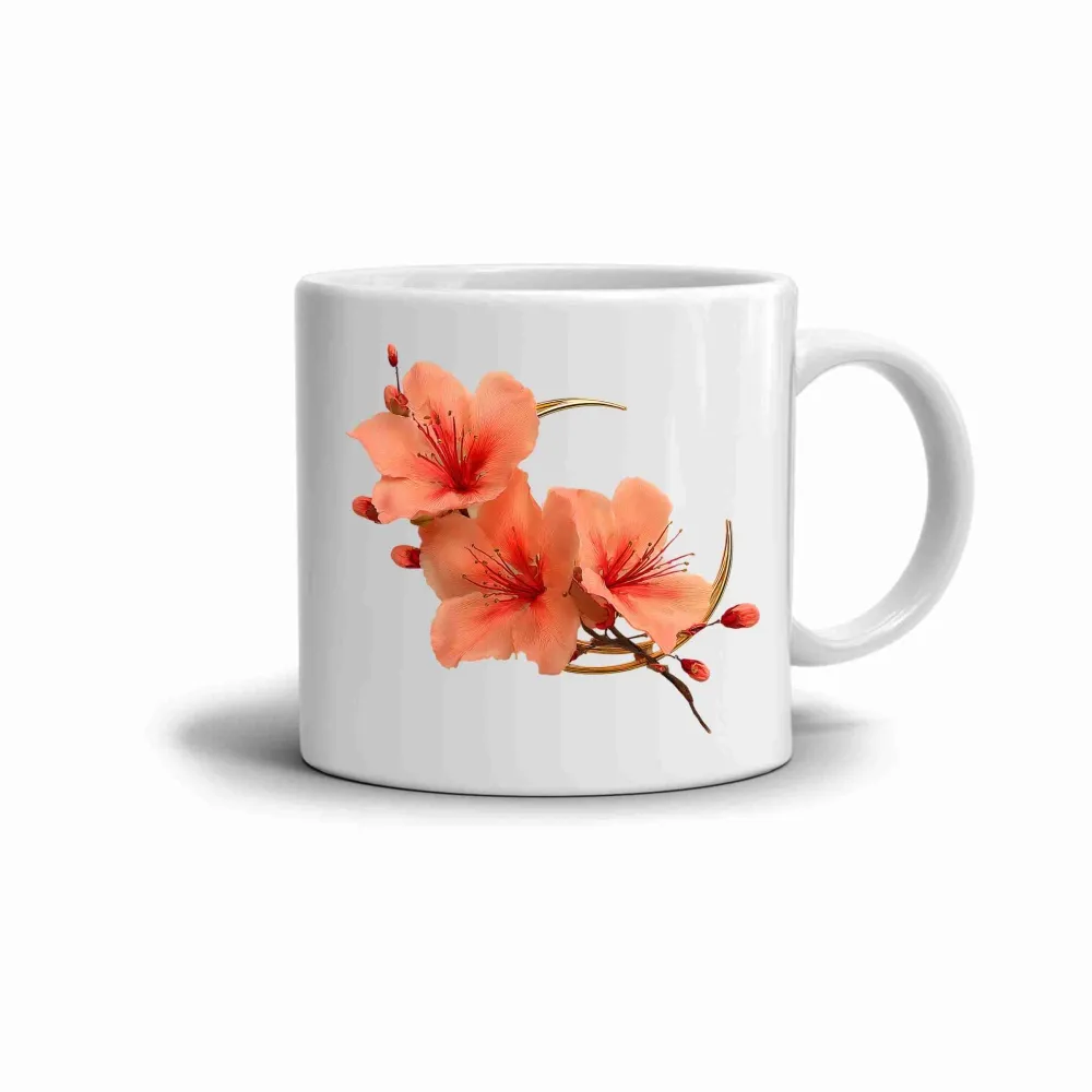 A narancs és piros árnyalataiban ragyogó, finom virágok arany díszítéssel tündökölnek a fehér háttéren. Ez a bögremotívum egyszerre gyengéd és feltűnő, a tavasz frissességét és a természet ébredésének szépségét idézi. Ideális választás mindazoknak, akik szeretik az elegáns és harmonikus részleteket a mindennapokban.