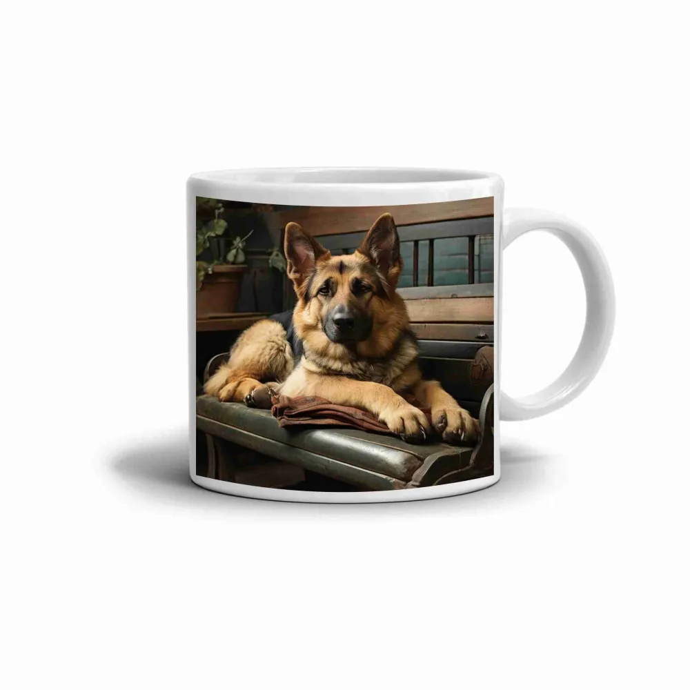 A bögrén egy német juhászkutya látható nyugodt környezetben pihenve, amely kiemeli kiegyensúlyozott és méltóságteljes megjelenését. A motívum természetes és részletgazdag hatást kelt, különös figyelmet fordítva a szőrzetre és a fajta jellegzetes vonásaira. Az összhatás nyugodt és kellemes, amely megszólítja a kutyák és a természetes motívumok kedvelőit.