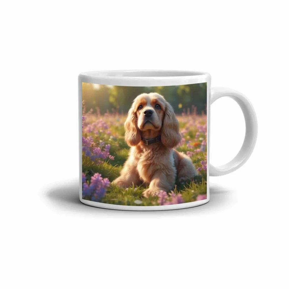 A bögre motívuma egy aranyszínű kutyust ábrázol, aki egy virágos réten pihen a meleg napsütésben. Nyugodt tekintete és puha bundája a békét és a barátságot sugározza. A természetes színek és a lágy fény harmonikus, pozitív hangulatot teremtenek, amely minden pillantásra örömet kelt.