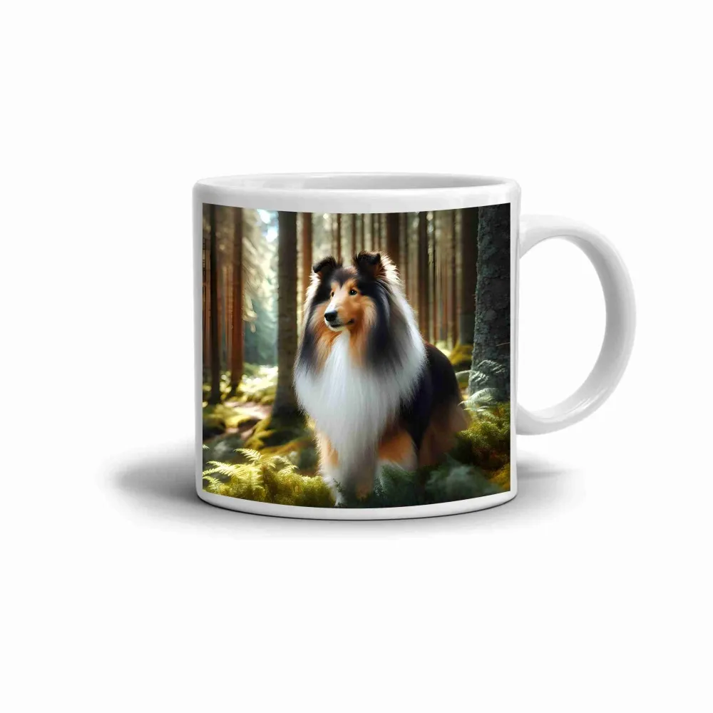 A bögre motívuma egy hosszú szőrű, elegáns kutyát ábrázol, aki békésen áll a napsütötte erdőben. A fák között átszűrődő fény meleg, harmonikus hangulatot teremt, amely nyugalmat és természetes szépséget sugall. Az egész motívum kiegyensúlyozott és barátságos, örömet okoz minden természet- és állatkedvelőnek.