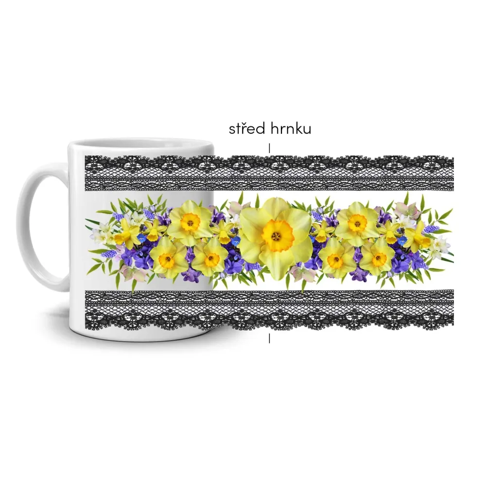 A sárga nárciszokkal és lila virágokkal díszített motívum vidám és friss hangulatot kelt. A ragyogó színek és a finom fekete csipkeszegély elegáns, mégis játékos összhatást adnak. Ez a bögre tavaszi energiát és egy kis romantikát hoz a mindennapokba.