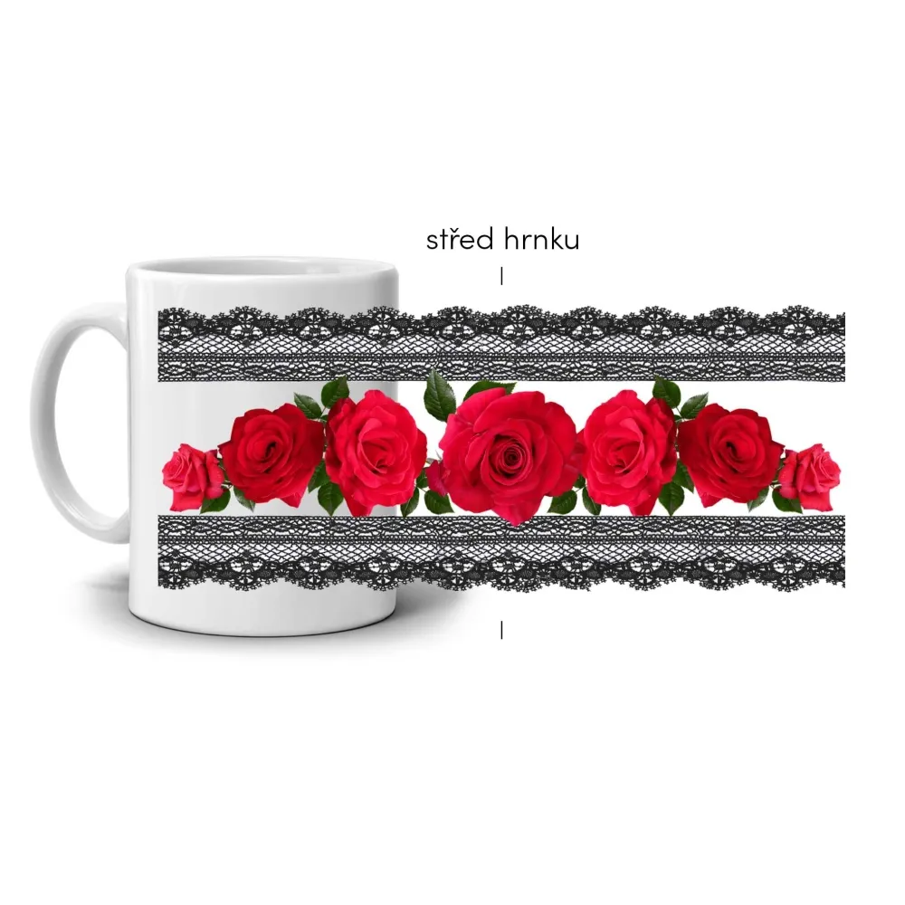 A piros rózsákkal díszített motívum elegáns és határozott megjelenést sugároz. A telt virágok, a mélyzöld levelek és a fekete csipkeszegély kontrasztja szenvedéllyel és finom eleganciával tölti meg a dizájnt. Ez a bögre a klasszikus szépség és az időtlen stílus megtestesítője.