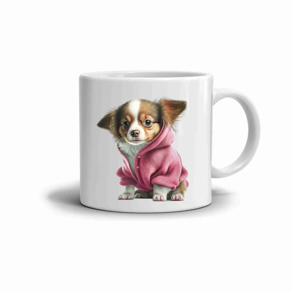 A bögre motívja egy bájos kutyust ábrázol rózsaszín pulóverben, aki kedvességet és barátságosságot sugároz. A finom rózsaszín és barna árnyalatok harmonikus kontrasztot alkotnak, így a motívum meleg és vidám hatást kelt. A részletesen kidolgozott szőrzet, a kifejező szemek és a lágy árnyékolás élethű megjelenést biztosítanak, ami különleges karaktert ad a bögrének. Ez a bögre a kedvesség és az öröm megtestesítője, amely feldobja a mindennapokat.