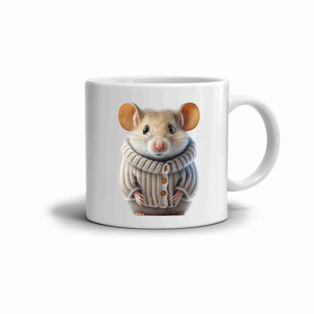 A bögrén egy kötött pulóvert viselő egér jelenik meg, amely kedves és barátságos benyomást kelt. A motívum letisztult és átlátható, felesleges díszítések nélkül, így jól illeszkedik a mindennapi használathoz. Az illusztráció finom hangulatot ad a bögrének, és kellemesebbé teszi a meleg italok melletti pillanatokat.