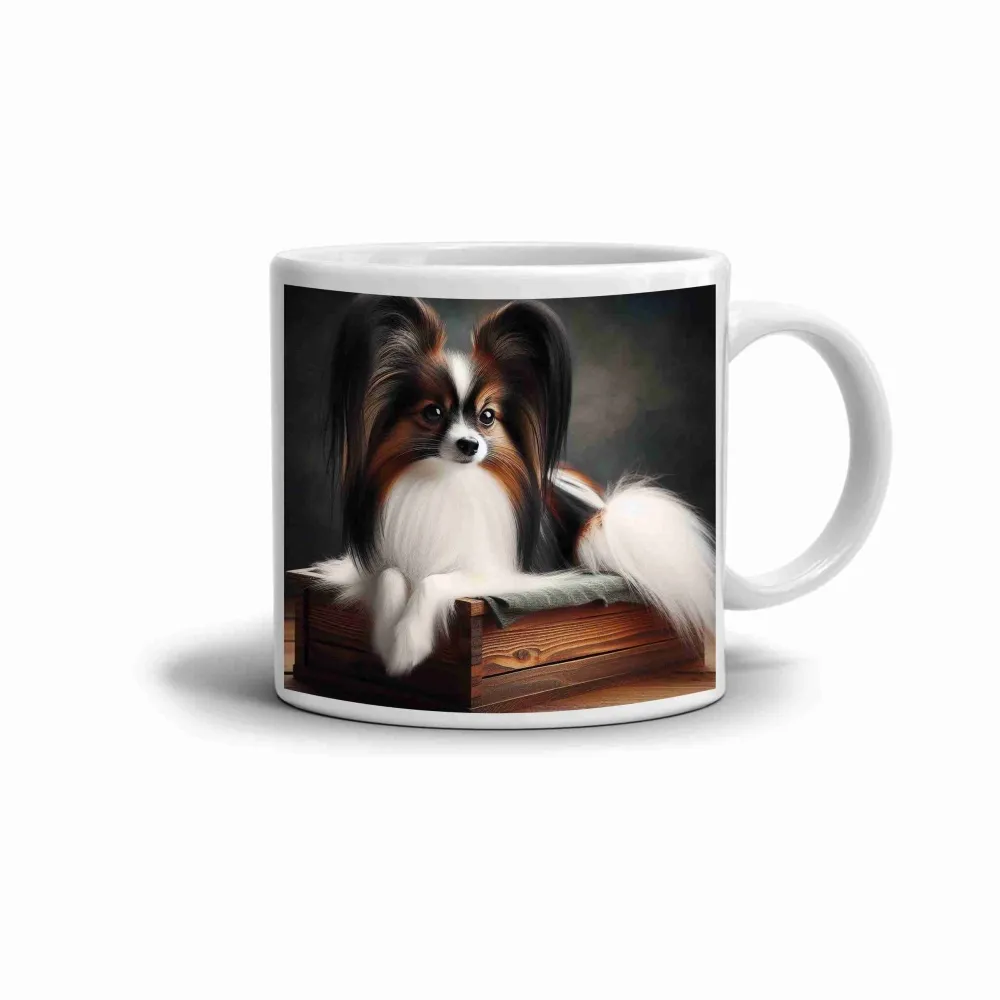 A kifinomult papillon motívum egyszerre sugároz eleganciát és gyengédséget. A kutya hosszú, selymes bundája és nyugodt tekintete harmóniát és természetes szépséget áraszt. Ez a bögre meghitt hangulatot visz a mindennapokba, tökéletes választás az állatkedvelőknek és az apró részletek rajongóinak.
