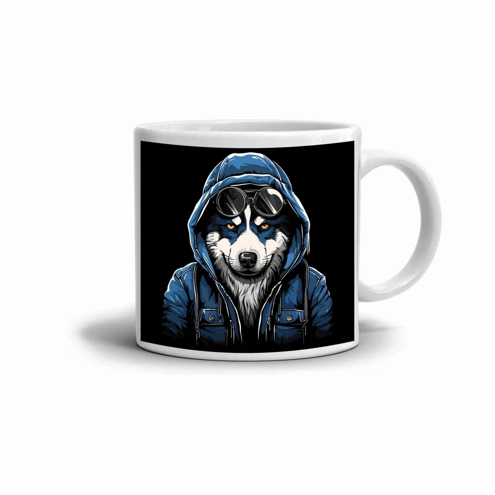 A bögrén egy farkas jelenik meg modern és karakteres stílusban, amely az állati motívumot városi hangulattal ötvözi. A sötét háttér és a kék tónusok kontrasztja kiemeli az átható tekintetet és az erőteljes sziluettet. Az összhatás határozott és eredeti, felesleges részletek nélkül.