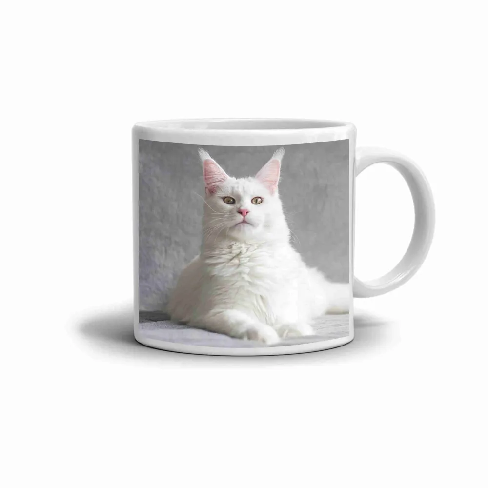 A bögrére egy gyönyörű maine coon macska került, amelynek hófehér bundája és nyugodt, méltóságteljes tekintete igazán különleges hangulatot teremt. Ez a macskás motívum lágy és kellemes atmoszférát visz a mindennapokba, a részletgazdag kidolgozás pedig még karakteresebbé teszi a bögrét.