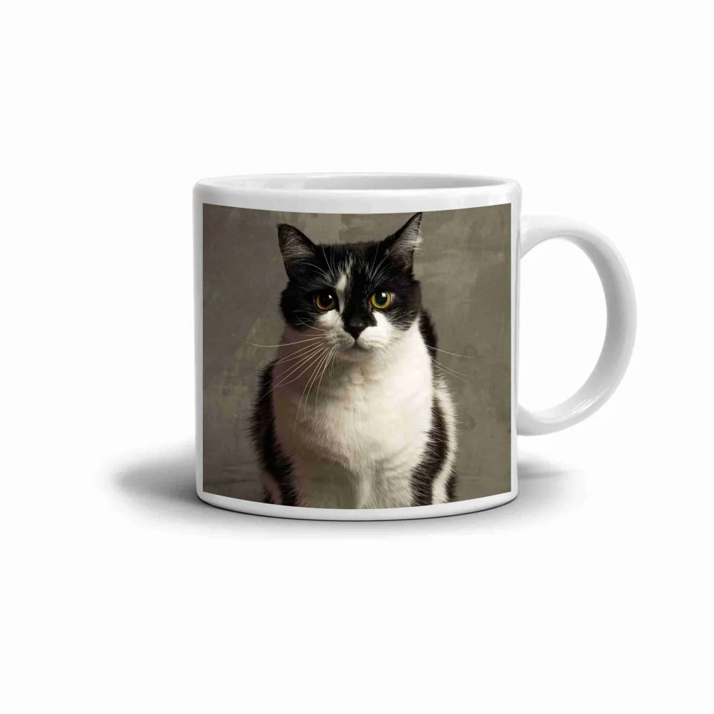 A fekete-fehér macska kifejező portréja finom és egyedi motívumot ad ennek a bögrének, amely egyszerre sugároz nyugalmat és kedvességet. A részletesen ábrázolt szőrzet, a hangsúlyos szemek és a kontrasztos színek lágy eleganciát teremtenek, így a motívum természetes és kellemes összhatást kelt.