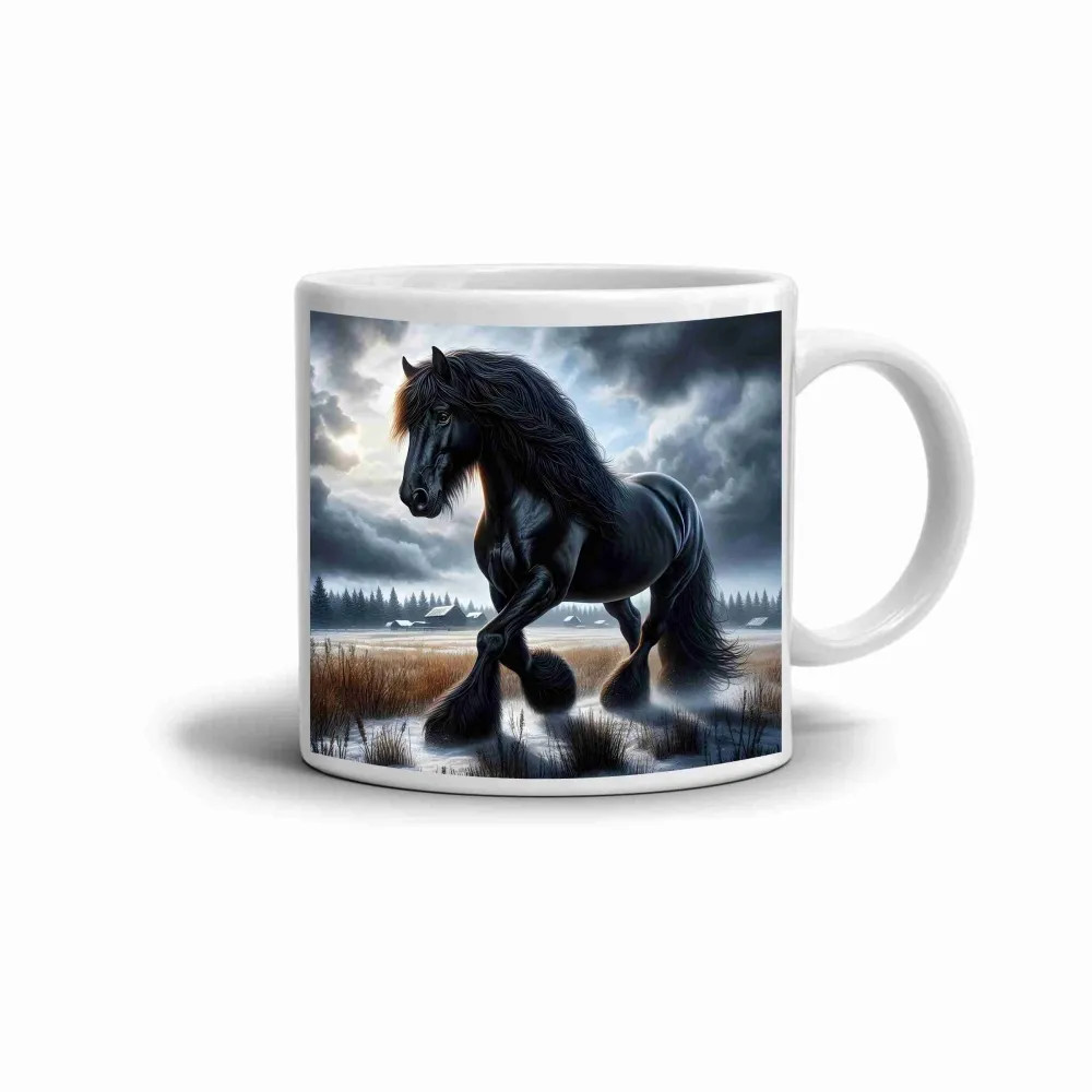 A bögrén egy fekete ló drámai tájban jelenik meg, mozgás közben ábrázolva. A motívum határozott és karakteres, mégis kiegyensúlyozott és jól áttekinthető. A természet és a lendület találkozása olyan képet ad, amely figyelemfelkeltő, ugyanakkor alkalmas a mindennapi használatra.