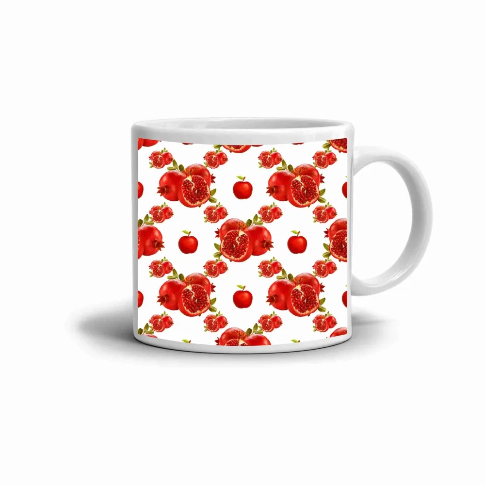 A vidám minta, amely gránátalmákat, almákat és virágokat ábrázol, frissességet és energiát sugároz. A motívum a természet szépségét ötvözi az élénk színekkel, amelyek az öröm és az életerő hangulatát keltik. A mélypiros árnyalatok a fehér háttéren feltűnő kontrasztot alkotnak, és üde, pozitív megjelenést adnak a bögrének. Ez a játékos design örömet okoz mindazoknak, akik szeretik a gyümölcsös mintákat és a színes stílust.