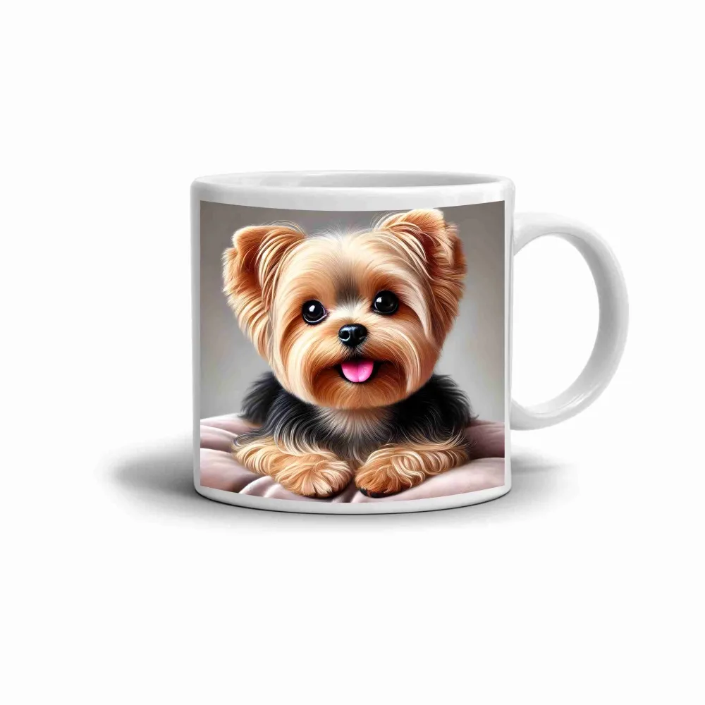 A bájos yorkshire terrier motív első pillantásra elvarázsol vidám arckifejezésével és ragyogó szemeivel. Ez a kis kutyus tele van energiával, és minden napba derűt és jókedvet visz. Ez a bögre tökéletes választás azoknak, akik szeretik a kutyákat és a vidám, játékos dizájnt, amely feldobja a mindennapokat.
