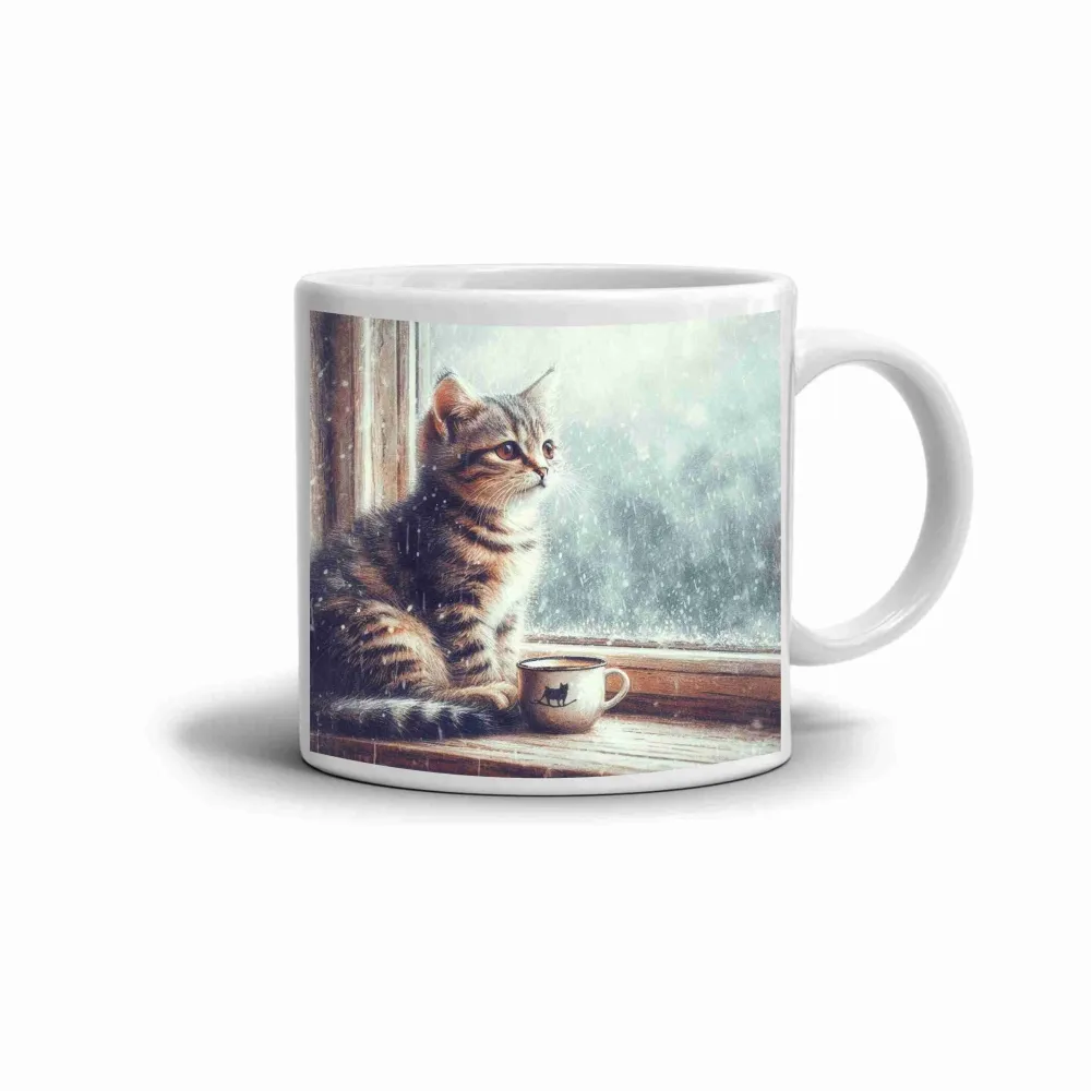 A téli ablaknál üldögélő kiscicát ábrázoló jelenet finom, meghitt hangulatot ad ennek a bögrének. A motívum lágy és mesés, mintha a kis cica csendben figyelné a hulló hópelyheket, miközben élvezi az otthon melegét.