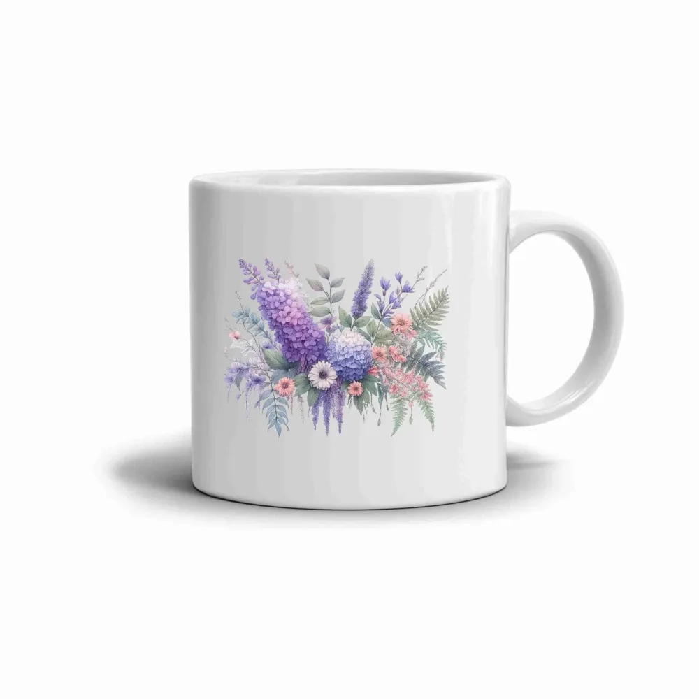 A finom levendula-, rózsaszín- és kék árnyalatú virágcsokor nyugodt és harmonikus kompozíciót alkot, amely elegáns és friss hatást kelt. A lágy virágok és a diszkrét levelek szépen kiegészítik egymást, romantikus jelleget adva a bögrének. Ez a design örömet szerez mindazoknak, akik szeretik a természetes szépséget, a gyengédséget és a stílusos megjelenést.