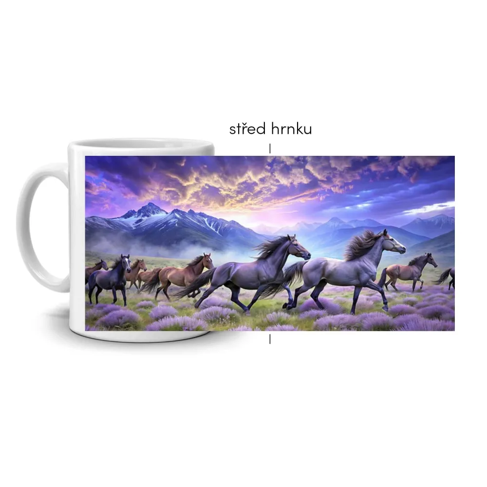 A lenyugvó nap fényében úszó táj és a szabadon vágtázó lovak csodálatos jelenetet alkotnak, amely a szabadság és a nyugalom érzését sugározza. Az ég és a hegyek lila árnyalatai mélységet és varázslatos hangulatot kölcsönöznek a mintának. A bögre motívuma a természet erejét, a mozgás harmóniáját és a belső békét idézi, miközben minden nap inspirál a pillanat megélésére.