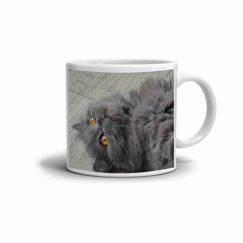 Az elegáns perzsa macska finoman részletgazdag, puha bundájával és ragyogó borostyánszínű szemeivel azonnal magára vonja a figyelmet. A játékos, mégis nyugodt póz meleg, barátságos hangulatot teremt, így a motívum igazi öröm minden macskarajongónak. A bögrére nyomtatott kép kedves, otthonos érzetet ad minden egyes kortynál.