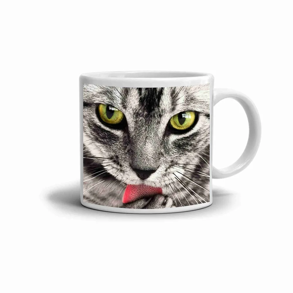 Első pillantásra ez a bögre a macska zöld szemeivel és részletes portréjával ragadja meg a figyelmet, így igazán látványos bögremotívum jön létre. A markáns arcvonások és a játékosan kinyújtott nyelv élénk, kedves hangulatot adnak, ezért a bögre egyszerre egyedi és bájos.
