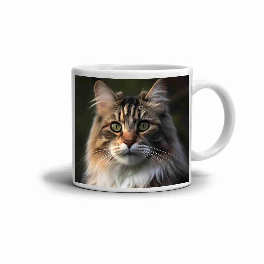 A bögrén egy gyönyörű, hosszú szőrű macska látható, amelynek jellegzetes háromszínű bundája és élénk zöld szemei azonnal megragadják a tekintetet. A gondosan megalkotott motívum elegáns és életteli hatást kelt, kiemelve az állat természetes szépségét és finom részleteit.