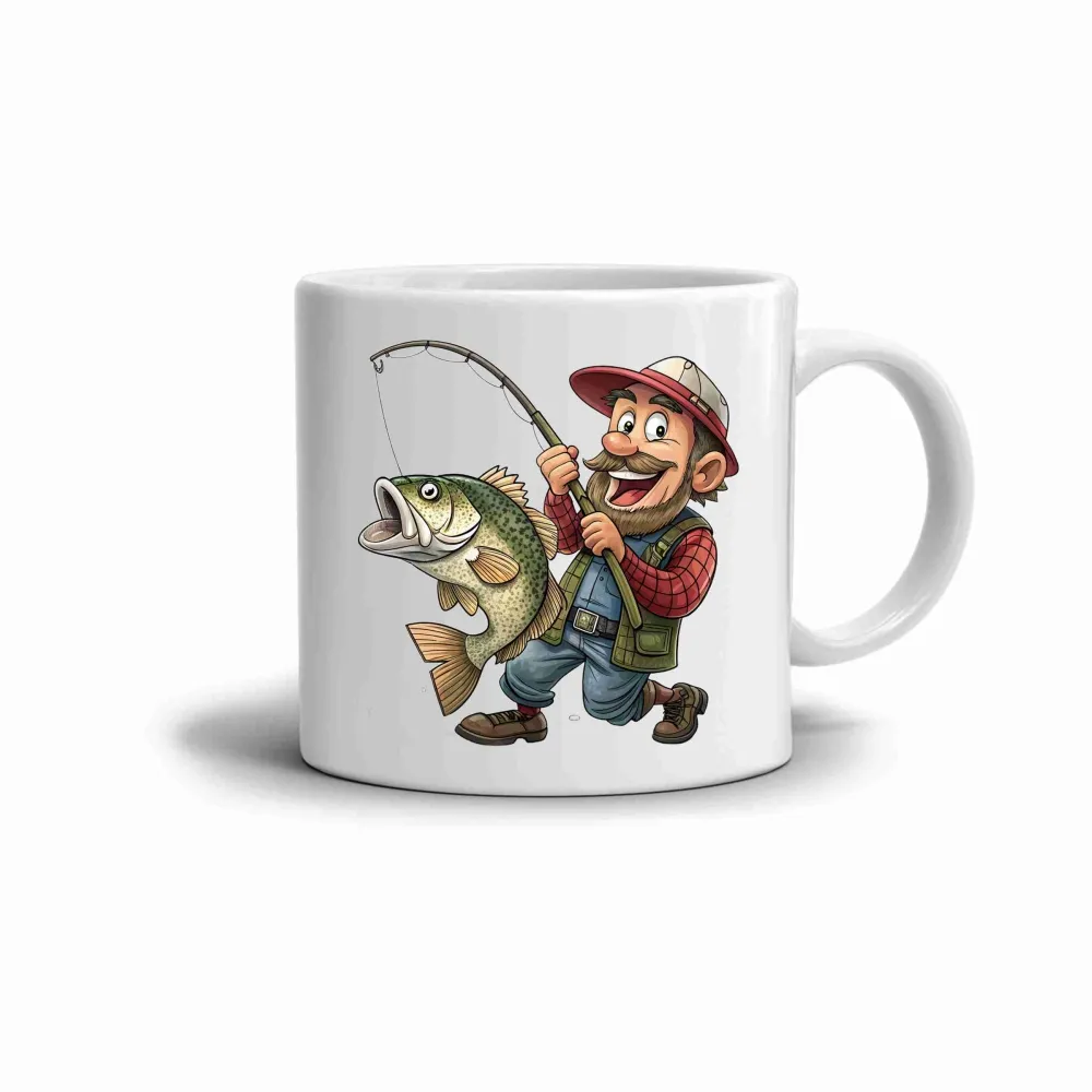 A vidám horgász és hatalmas fogása életre kelti a bögre játékos és optimista hangulatát. A színes, rajzfilmszerű stílus friss és vidám hatást kelt. Ez a bögremotívum örömet szerez minden horgásznak, aki szeretné kedvenc hobbiját megidézni egy csésze kávé vagy tea mellett.
