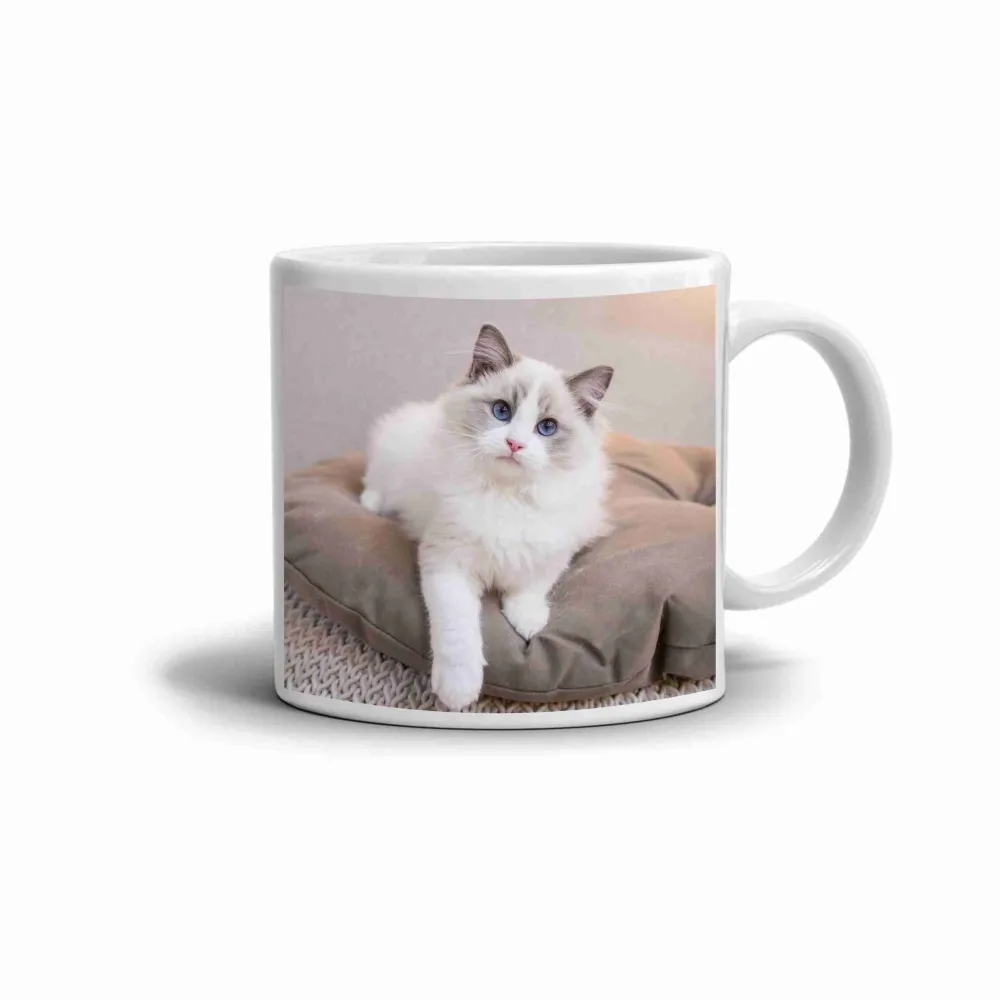 A bájos ragdoll motívum egy puha, világos bundájú és gyönyörű kék szemű cicát ábrázol, amely nyugodt és kellemes hangulatot teremt. A finom színek és az aranyos tekintet különleges varázst adnak a bögrének, így ideális társ a pihentető pillanatokhoz. A motívum kedves és harmonikus megjelenése minden macskakedvelőt elbűvöl.