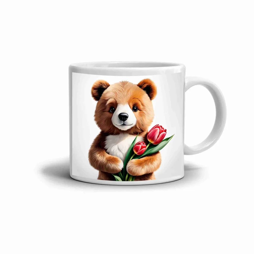 Az aranyos mackó, aki piros tulipánokat tart, gyengédséget, örömet és nyugalmat sugároz. A finom narancs és fehér árnyalatok a élénk virágokkal együtt egy játékos motívumot alkotnak, amely minden nap frissességet és optimizmust visz. Ez a bögre minden nap italának fogyasztásához energiát és kellemes hangulatot ad. Ideális mindazoknak, akik szeretik a szépséget és a finom játékosságot a mindennapokban.