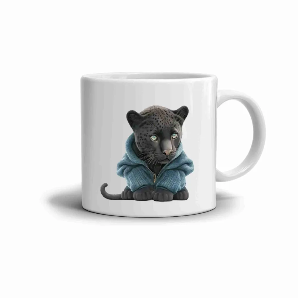 A bögre motívja egy elegáns párducot ábrázol kék pulóverben, aki nyugodtan és magabiztosan ül. Zöld szemei és sötét bundája erős kontrasztot alkotnak a fehér háttérrel, ami titokzatos hangulatot kölcsönöz az egész kompozíciónak. Az elegancia és a finomság harmonikus egyensúlya különlegessé teszi ezt a bögrét, amely ideális választás a pihenés pillanataihoz. Ez a motívum mindenkit megszólít, aki szereti az állatokat, a stílust és az egyedi designt.