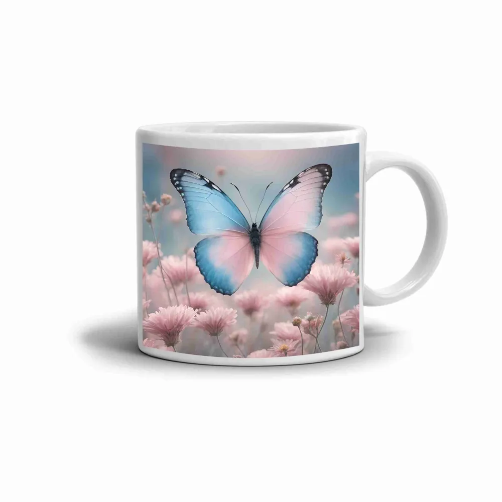 A rózsaszín virágmező felett lebegő kék-rózsaszín pillangó a könnyedség és a szépség megtestesítője. A bögre motívuma a természet finom eleganciáját, a békét és a harmóniát idézi. A pasztell árnyalatok kombinációja megnyugtató, lírai hatást kelt, amely minden pillantásra örömet hoz.