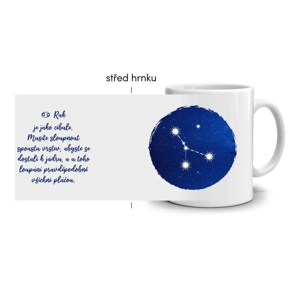 A rák csillagjegy motívuma a finomságot, empátiát és a világ mély megértését fejezi ki. Ez a jegy az érzékenységéről és a gondoskodó természetéről ismert. A bögrén látható rák csillagkép a kék égbolton az érzelmeket, az intuíciót és a belső erőt jelképezi, amely a nyugalom felszíne alatt rejtőzik. Az összhatás harmonikus, és meleg, megnyugtató hangulatot áraszt.
