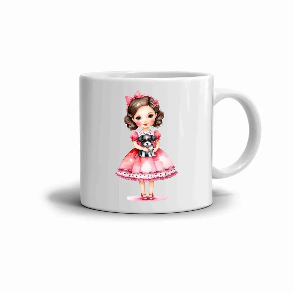 A bögre motívuma egy aranyos kislányt ábrázol rózsaszín ruhában, amint gyengéden tartja karjaiban a kis kutyáját. A lágy színek és a kedves kifejezés meleg, szeretetteljes hangulatot teremtenek. Az egész motívum bájos, kedves és a gyermeki őszinteséget, valamint a barátságot idézi.