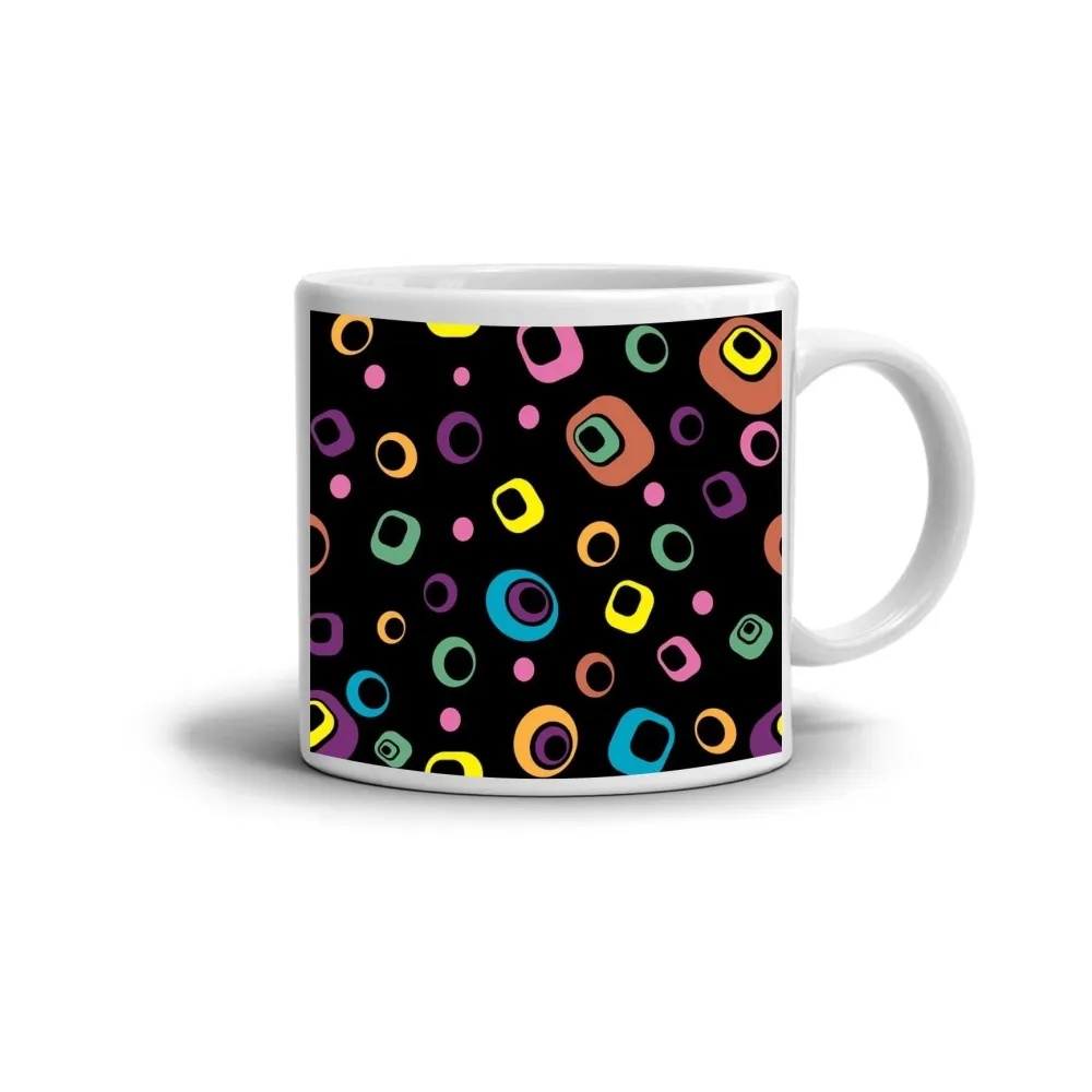 A bögrén egy feltűnő Absztrakt motívum látható, amely a színek és formák játékával ragadja meg a figyelmet. A fekete háttéren elhelyezett színes körök és négyzetek mozgást és vidám energiát sugároznak. Ez a minta modern és eredeti hatást kelt, miközben minden kávé- vagy teázást egy kis kreativitással fűszerez meg.