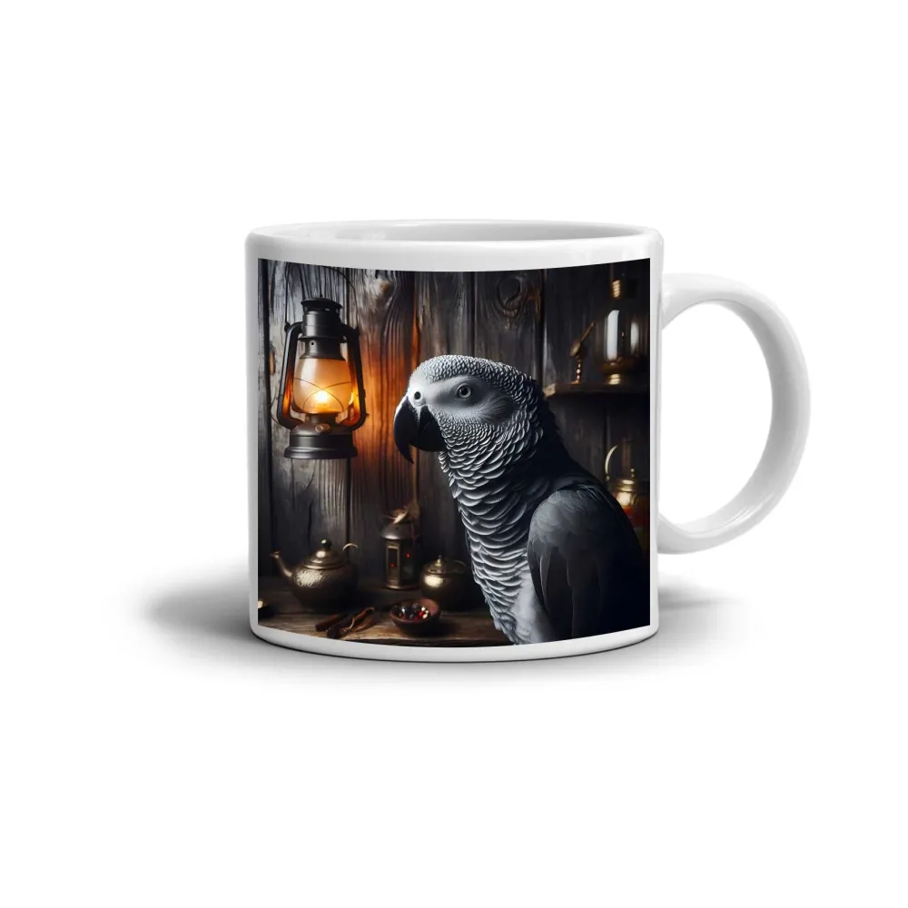 A sötét és elegáns jáko papagáj motívum titokzatos és nemes hangulatot áraszt. A szürke árnyalatok és a régi lámpa meleg fénye nyugodt, mély atmoszférát teremt. Minden tollrészlet aprólékosan kidolgozott, kiemelve ennek az intelligens madárnak a szépségét. A bögre művészi kidolgozásával hódít, és minden naphoz egy kis egyediséget és stílust ad.