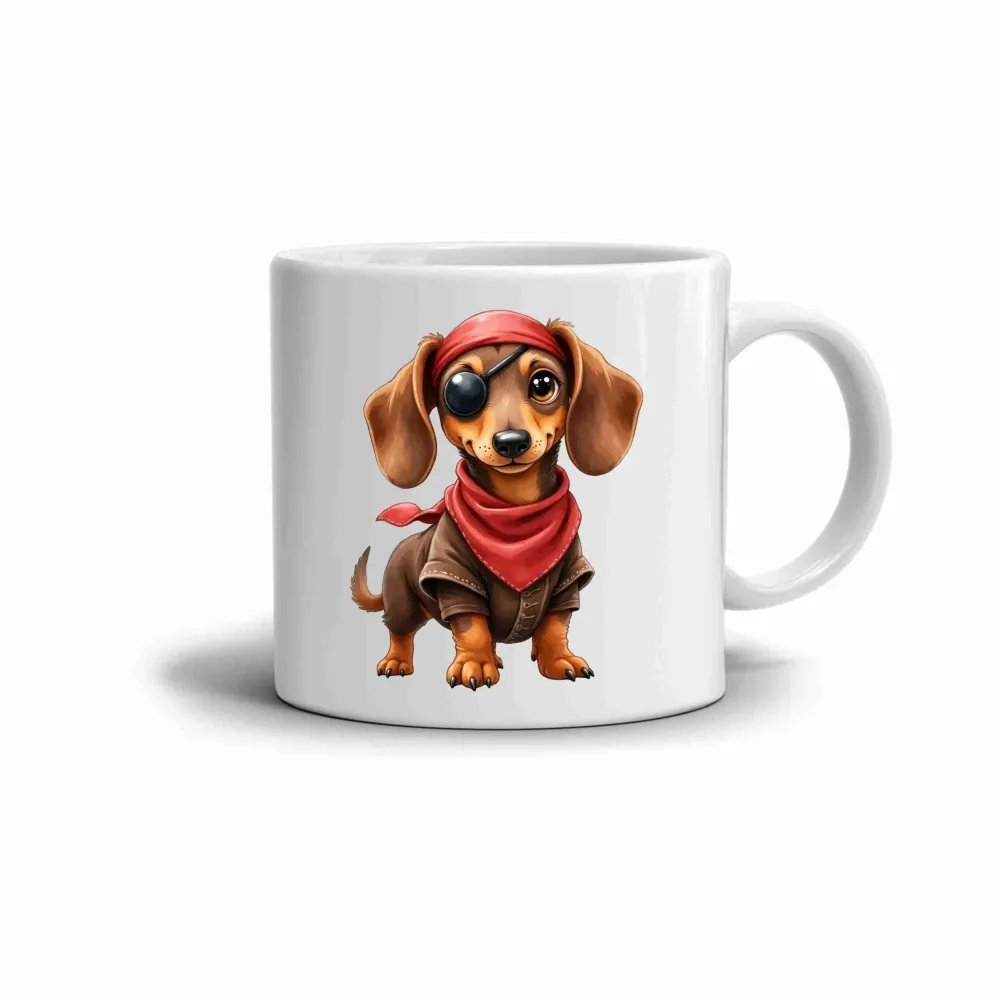 A bögre motívuma vidám és bájos hangulatot áraszt. A kis tacskó kalózként, piros kendőben és fekete szemkötővel jelenik meg, ami játékos és kalandos jelleget ad az egész mintának. A színes részletek életre keltik a dizájnt, és minden napra egy kis derűt és fantáziát hoznak.