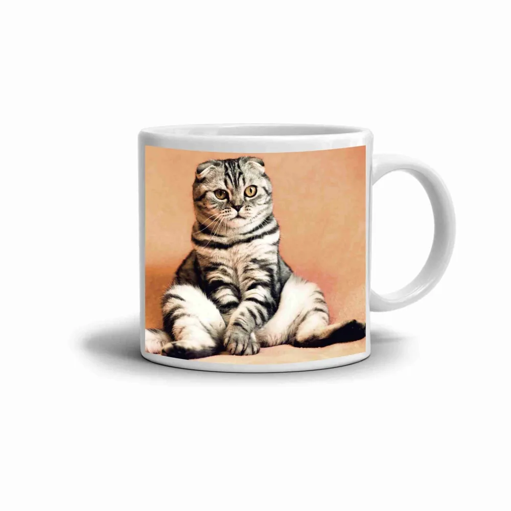 Ezen a bájos motívon egy játékos skót lógófülű cica látható, aki lazán üldögél és kedves tekintetével azonnal magára vonja a figyelmet. A finom csíkozás és a meleg borostyánsárga szemek különösen szerethető hangulatot teremtenek, így a bögre már első pillantásra jókedvet sugároz.
