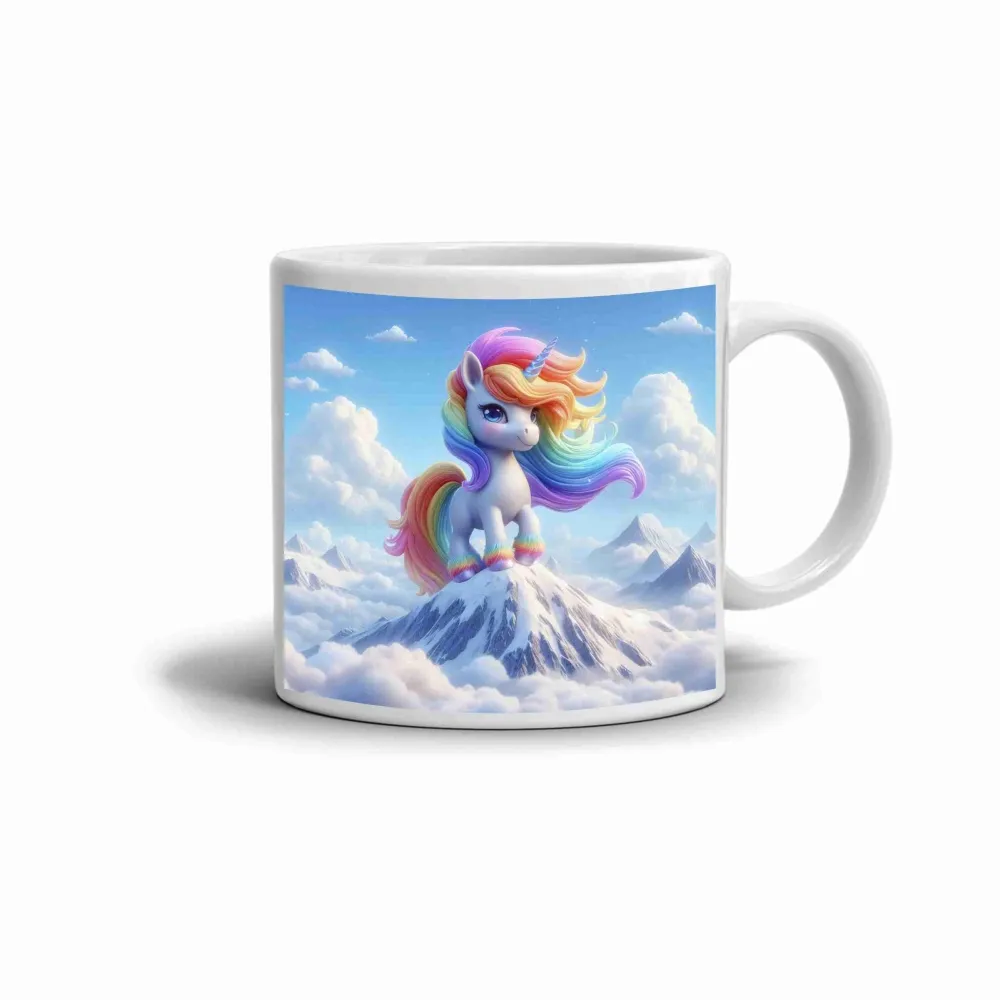 A hegyek fölött lebeg egy bájos egyszarvú szivárványos sörénnyel, mintha egy mesevilágból lépett volna elő. A bögre motívuma vidám, színes és tele van pozitív energiával. Az égszínkék háttér, a havas csúcsok és a ragyogó árnyalatok együtt varázslatos hangulatot teremtenek, amely az öröm és a fantázia világát idézi.