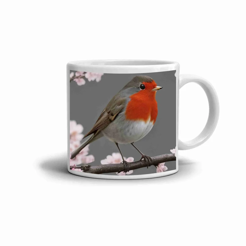 Fehér kerámia bögre, amelyen egy vörösbegy látható, amint egy ágon ül a virágok között. A színek és a részletgazdag motívum friss, tavaszi hangulatot kölcsönöz minden kortynál. A bögre alkalmas mindennapi használatra, valamint a természet szerelmeseinek is.