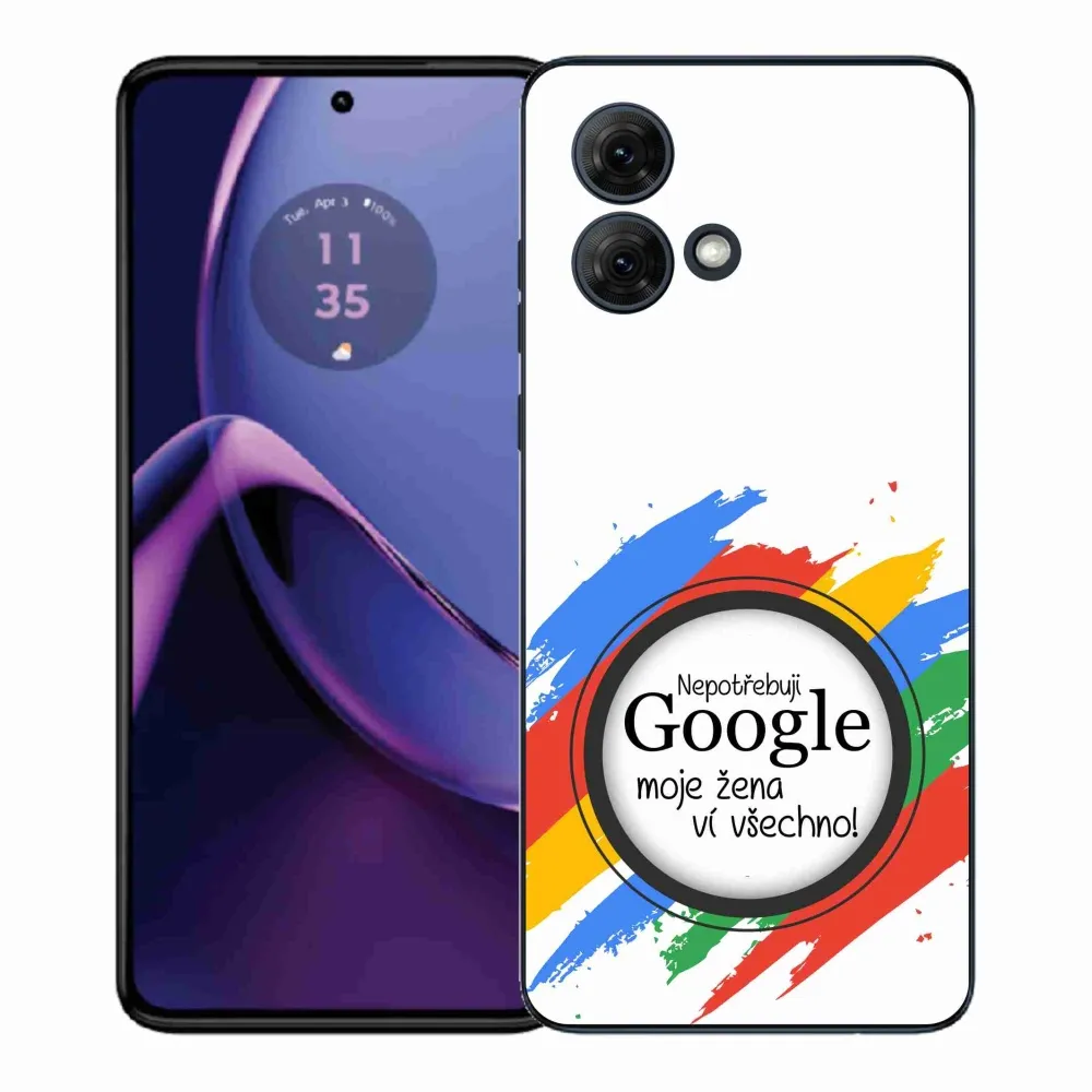 Rugalmas zselés tok mmCase a Motorola Moto G84 5G képével - a nő mindent tud fehér háttérrel