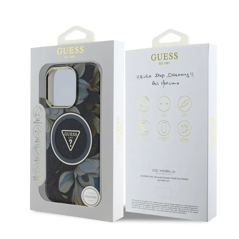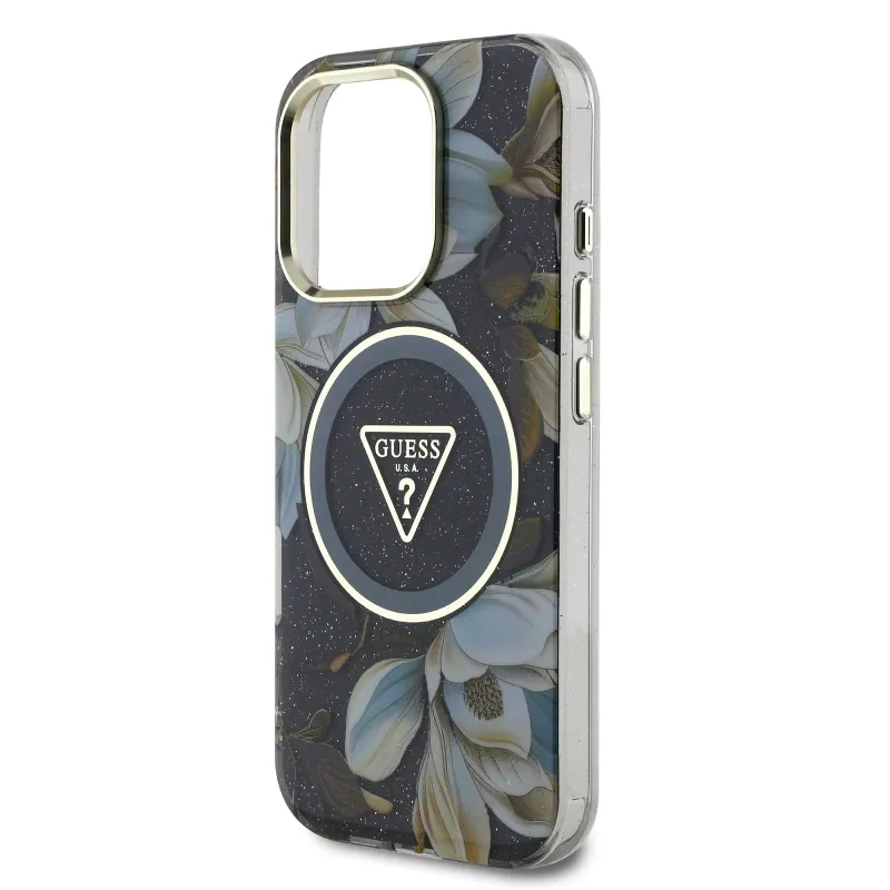 Guess IML Glitter Magnólia és háromszög logó MagSafe hátlap iPhone 16 Pro Max-hoz Fekete