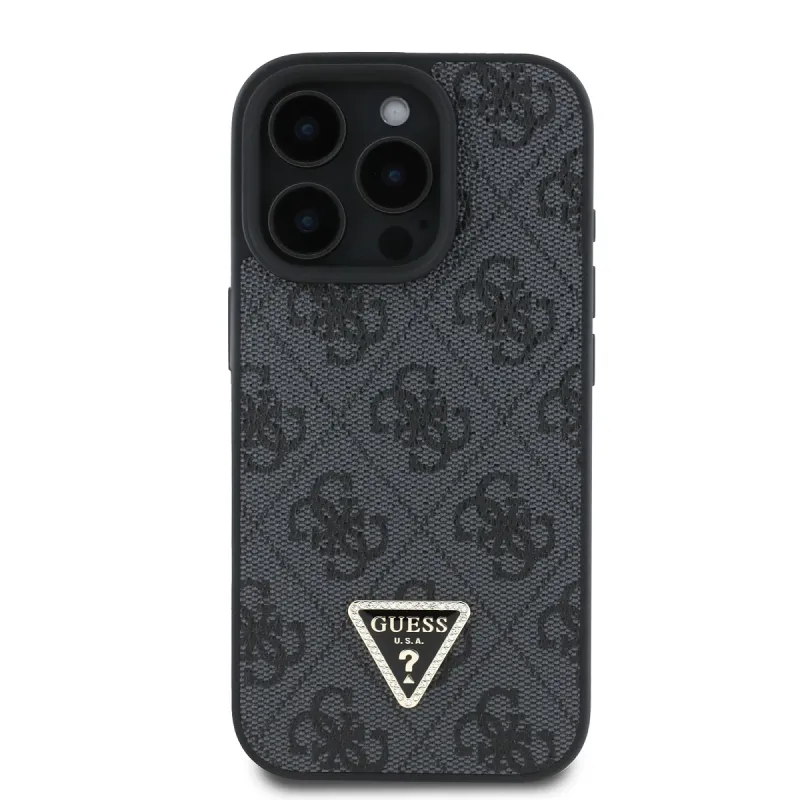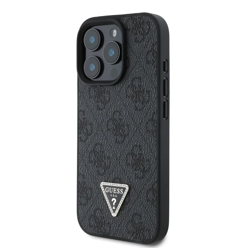 Guess PU 4G Strass háromszög fém logó hátlap iPhone 16 Pro fekete