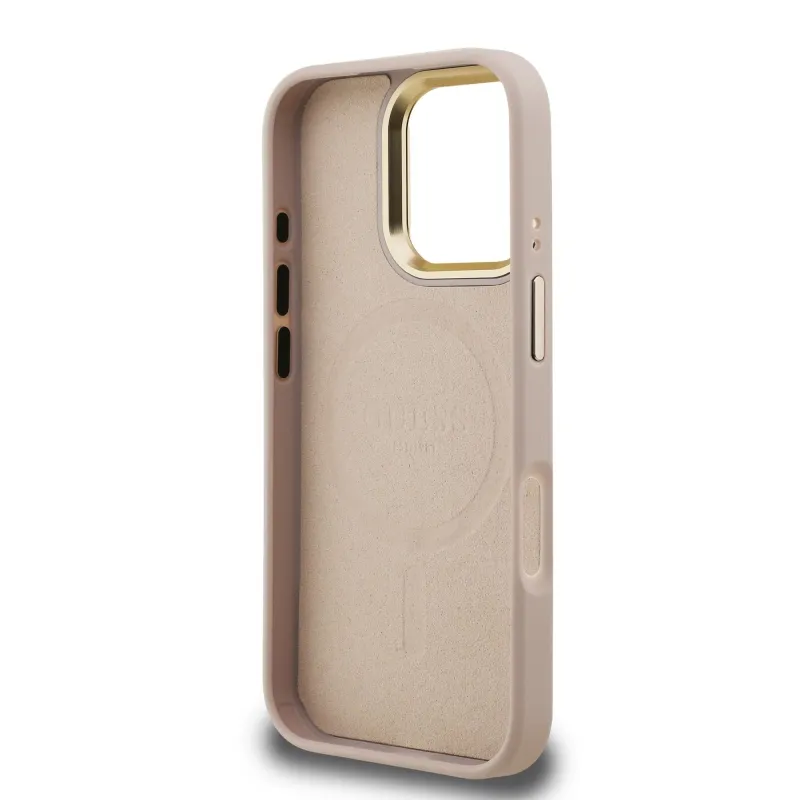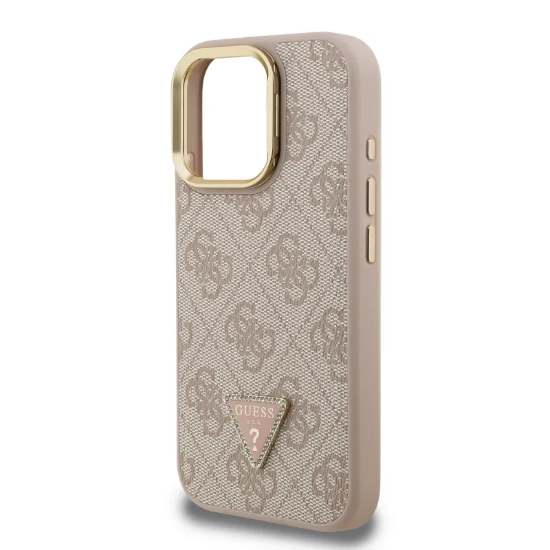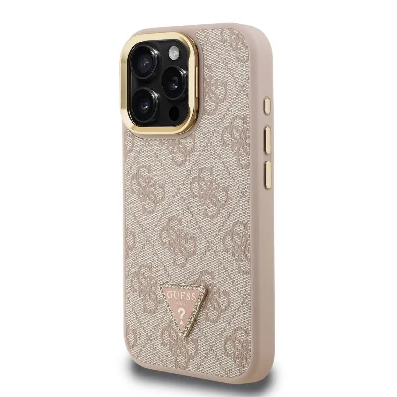 Guess PU 4G Strass háromszög logó állvány kamerakeret MagSafe hátlapi borító iPhone 16 Pro Max rózsaszínhez