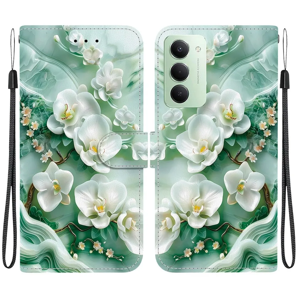 Sokoldalú pénztárca tok Xiaomi Redmi 15 5G (169mm) és fehér virágokhoz